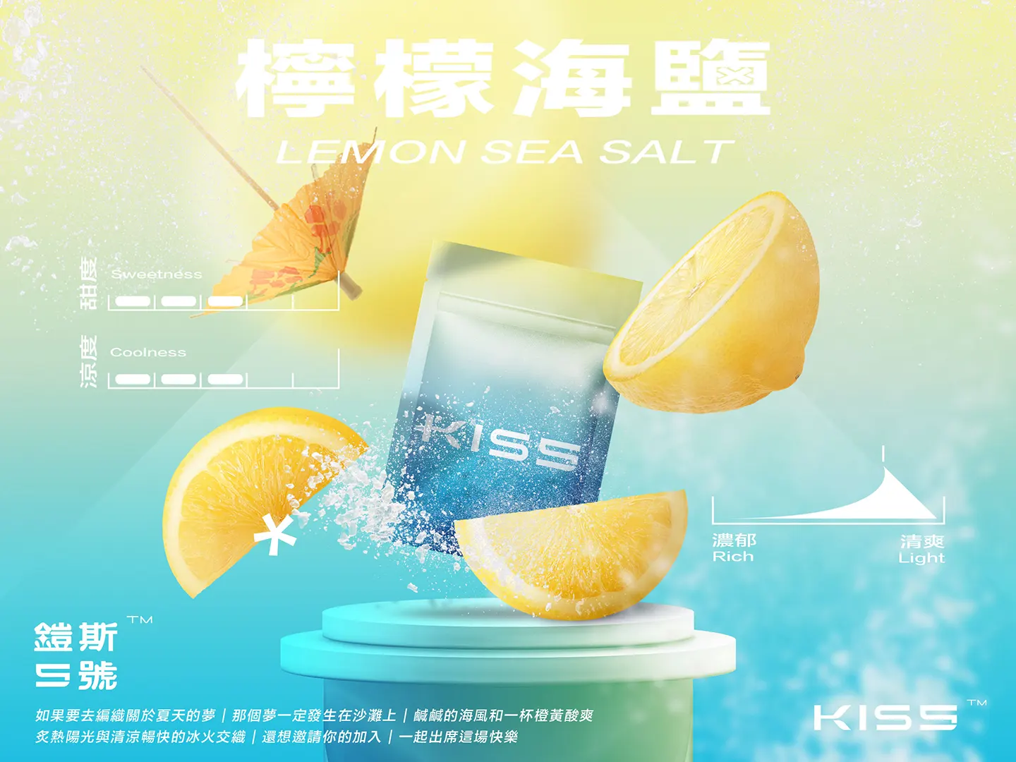 - ▶ 檸檬海鹽【甜度 6/涼度 6/口感 清爽8】如果要去編織關於夏天的夢,那個夢一定發生在沙灘上,鹹鹹的海風和一杯橙黃酸爽,炙熱陽光與清涼暢快的冰火交織,還想邀請你的加入,一起出席這場快樂。