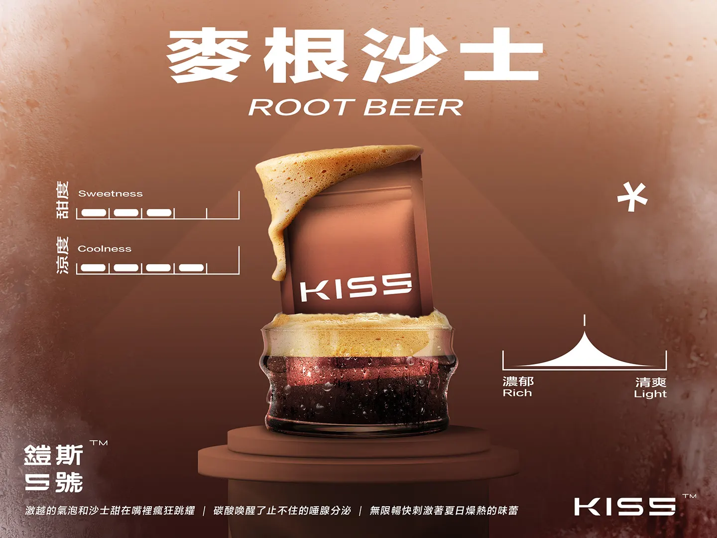 - ▶ 麥根沙士【甜度 6/涼度 8/口感 濃郁5】激越的氣泡和沙士甜在嘴裡瘋狂跳躍,碳酸喚醒了不住的唾腺分泌,無限暢快刺激著夏日燥熱的味蕾。