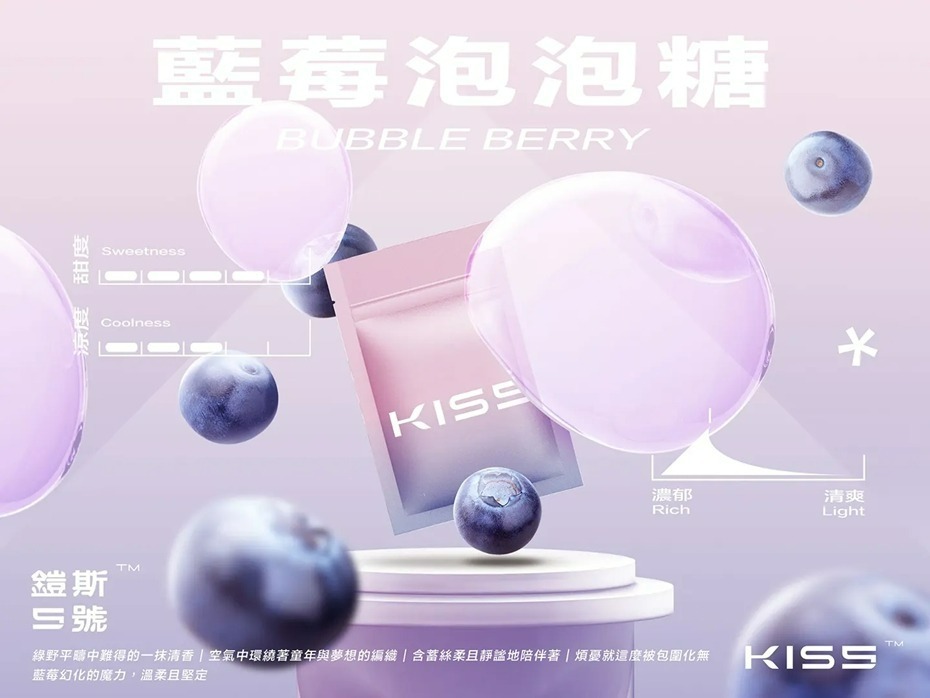 - ▶ 藍莓泡泡糖【甜度 9/涼度 5/口感 濃郁8】綠野平疇中難得的一抹清香,空氣中環繞著童年與夢想的編織,含蓄絲柔且靜謐地陪伴著,煩憂就這麼被包圍化無,藍莓幻化的魔力,溫柔且堅定。